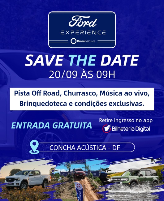 Brasília se prepara para receber um dos eventos mais esperados do calendário automotivo e cultural: o Ford Experience. No próximo sábado, 20 de setembro, das 9h às 17h, a Concha Acústica, às margens do Lago Paranoá, vai reunir gastronomia, música ao vivo, atividades para crianças e um circuito especial de test drive em SUVs e caminhonetes. A entrada é gratuita, mediante retirada de ingressos no site da Bilheteria Digital e doação de 1kg de alimento não perecível.