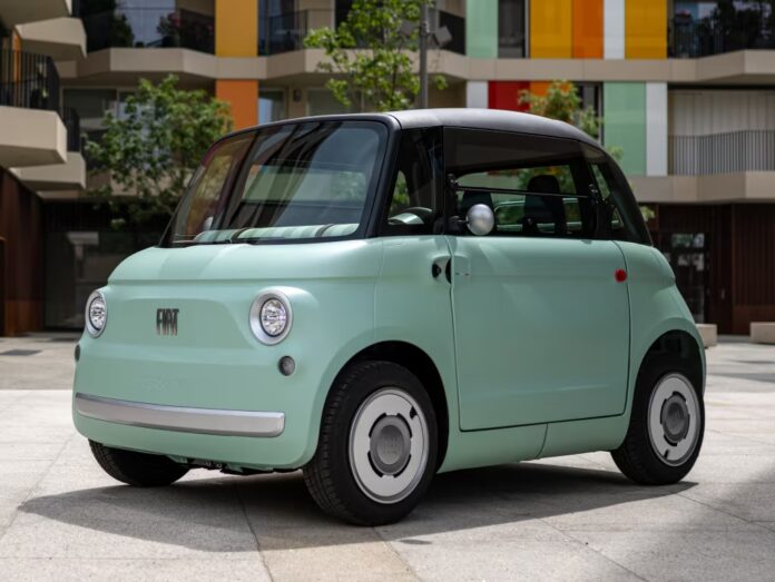 Visualmente, o Topolino se diferencia de seus “primos” por trazer mais identidade da Fiat, lembrando o 500 em vários detalhes: faróis circulares, lanternas verticais de LED, molduras cromadas nos para-choques e até o recorte da placa traseira. As rodas de aço recebem calotas clássicas, e os retrovisores cromados completam o ar retrô.